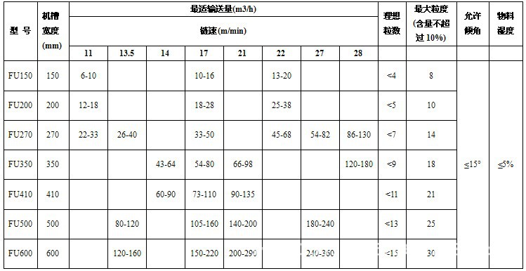 [1]FU 型鏈式輸送機的規格性能列入下表。表中列出了各機型在不同鏈速下的輸送能力范圍。同樣的輸送量可以在表中選到不同的機型,若選用較大機型則鏈速較低、磨損 小,但設備投資較高,若選用較小機型則鏈速較快,磨損相對較高,但設備投資較省。應當指出,當實際輸送量達不到該機輸送能力的65%時,由于機槽內物料層 過薄而造成輸送鏈空轉,也會增加設備的磨損。因此,建議輸送機的實際輸送量不宜低于表一中輸送能力的小值,以實際輸送量乘以1.2以后,也不宜高于表中 輸送能力的大值。