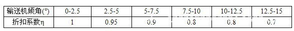 [2]當輸送機傾斜向上運行布置時(即進料端在下方,出料端在上方),其輸送能力將有所減少。此時輸送機的輸送能力應按下表乘以折扣系數η: